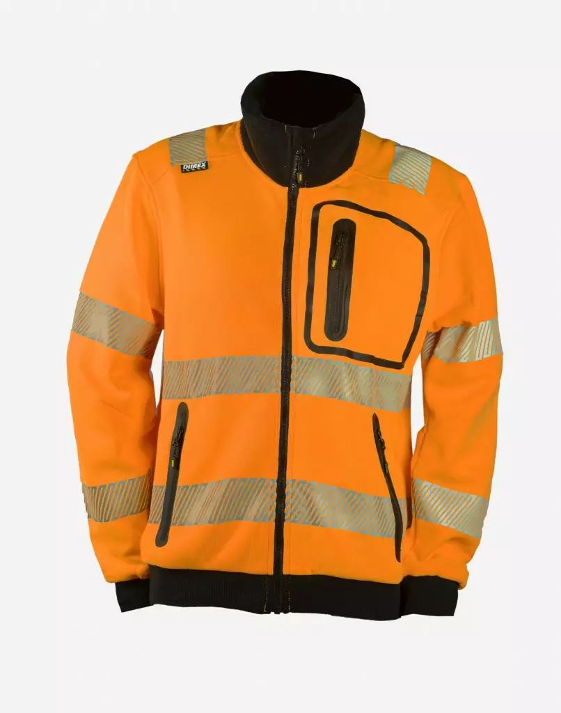 100% polyesteri, 290g/m² Hv-oranssi XS-3XL EN ISO 20471:2013 luokka 2 XS-3XL vetoketjullinen rintatasku, D-lenkki, vetoketjulliset alataskut, avoimet sisätaskut. Helmassa ja hihansuissa musta resori, olalla heijastin painatukset. Yhdisteltävyys näkyvyysluokkaan 3 Dimex alaosien kanssa