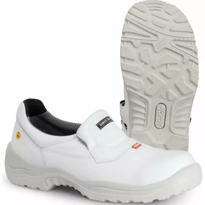 Mukava ja kestävä helposti puhdistettava valkoinen turvajalkine. Suojausluokka S2. PU-pinnoitettu nahkapäällinen tukee hyvin jalkaa. Öljynkestävä PU-ulkopohja antaa hyvän pidon liukkaissa olosuhteissa. Alumiininen JALAS®-varvassuoja. Pohjallisen PORON® XRD-kaksoisiskunvaimennusvyöhykkeet vaimentavat tehokkaasti iskuja. Sisä- ja ulkokäyttöön.