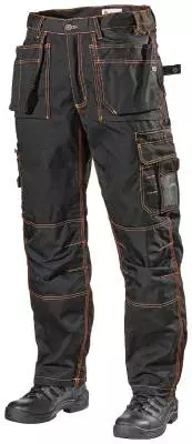 Kaksi riipputaskua, kaksi etu- ja takataskua. Sisäpuolella polvisuojataskut, kaksi eri korkeutta. Oikeassa lahkeessa puukkolenkki ja mittatasku kynätaskuilla. Vasemmassa lahkeessa läpällinen ulkotasku, sisätasku vetoketjulla, kaksi puhelintaskua, henkilökorttitasku sekä kaksi kynätaskua. Kaksi vasaralenkkiä.