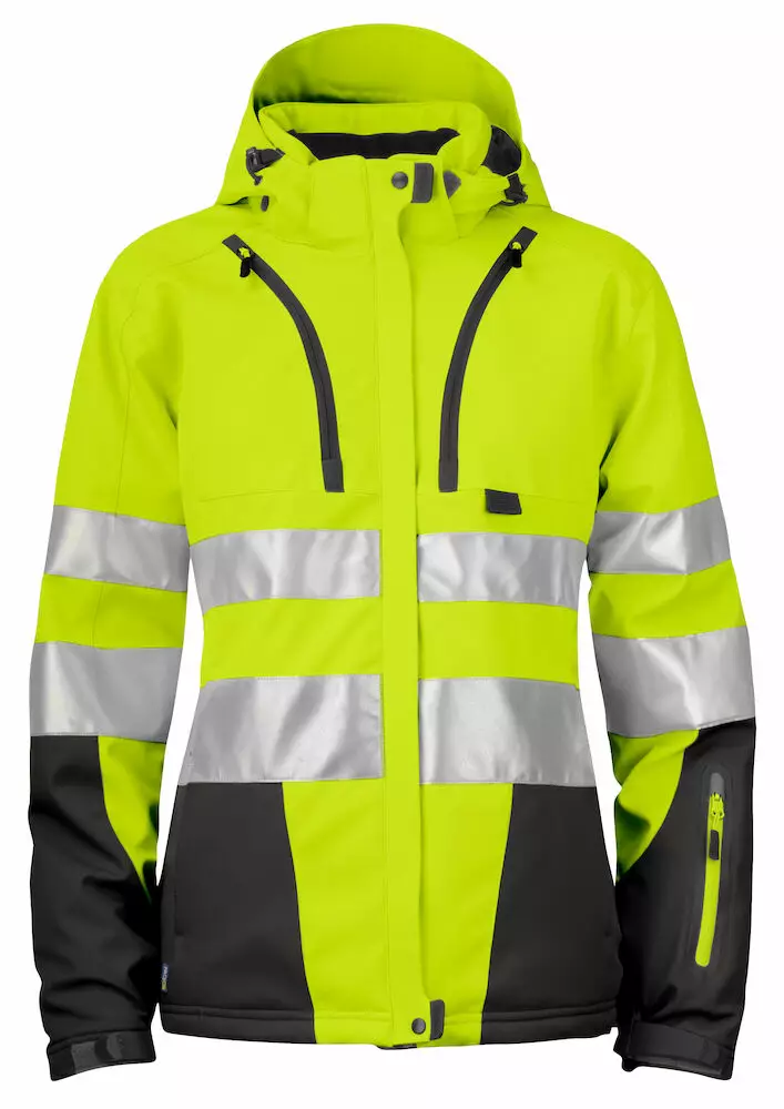 Naisten huomiotakki. Valmistettu teknisestä softshell-materiaalista, joka on tuulen- ja vedenpitävää. Tikattu toppavuori. Kaksi rintataskua, vasemmanpuoleisen sisällä puhelintasku. Kiinnike henkilökorttipidikkeelle. Kaksi vetoketjullista sisätaskua, joista toinen on suurempi ja sopii esim. papereiden säilytykseen. Kaksi sivutaskua. Yksi hihatasku vasemmassa hihassa. Vasemmalla puolella sisätasku, jossa aukko kuulokejohdolle. Vetoketjulliset tuuletusaukot kainaloissa. Säädettävä vyötärö. Säädettävät hihansuut. Pidempi selkäosa maksimoi käyttömukavuuden. Heijastavat tereet hihoissa ja selässä. Irrotettava ja säädettävä huppu. Kauluksen ja taskujen fleece-vuori lisää käyttömukavuutta.