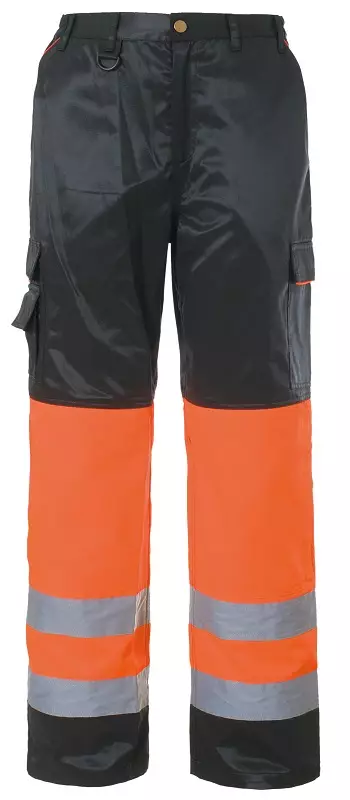 EN 471 luokitellut (luokka 1) huomiohousut. Väri: huomio-oranssi/musta. 8 kpl taskuja: kännykkätasku, tarralla suljettava henkilökorttitasku, sivutaskut, 2 läpällistä takataskua ja 2 läpällistä reisitaskua. Tuplaommellut saumat. Sivusta aukeavat ja tarralla suljettavat polvisuojataskut. Joustava vyötärökiristys. Leveät vyölenkit ja vasaralenkki. D-lenkki ja kynätasku.