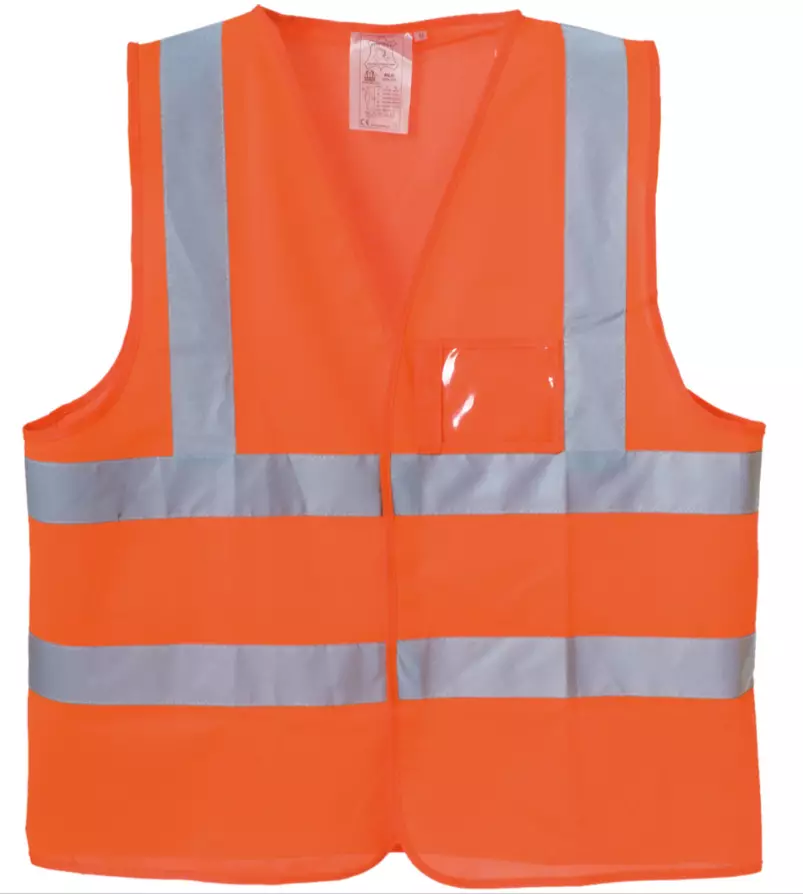 EN 471 luokiteltu oranssi huomioliivi, luokka 2, kunnon pitkä kiinnitystarra edessä takaa liivin hyvän paikallaolon ja turvallisuuden, materiaalina 100% polyester. Henkilökorttitasku. EN 471 lk 2.