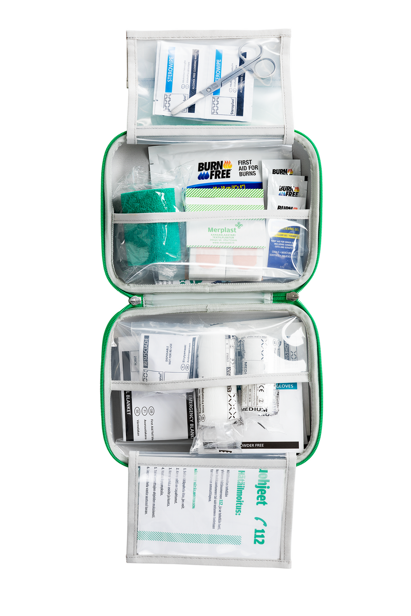 Safedo® -ensiapulaukku on varustettu kattavalla sisällöllä. Puolikova laukku pitää varusteet kunnossa ja selkeiden sisätaskujen ansiosta tarvittavat ensiaputuotteet löytyvät nopeasti.